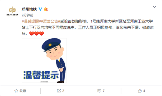 @鄭州地鐵 今早7:47發布消息稱:受設備故障影響,1號線河南大學新區站至河南工業大學站上下行雙向均有不同程度晚點,工作人員正積極搶修,給您帶來不便,敬請諒解。