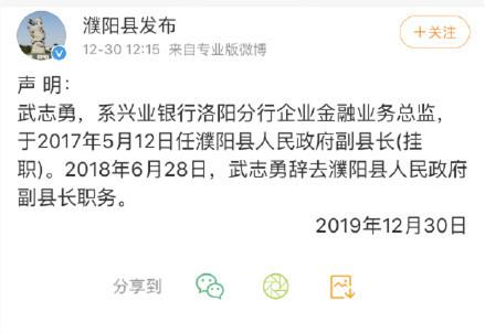 濮陽縣委宣傳部官方微博12月30日發布消息稱,武志勇,系興業銀行洛陽分行企業金融業務總監,于2017年5月12日任濮陽縣人民政府副縣長(掛職)。2018年6月28日,武志勇辭去濮陽縣人民政府副縣長職務。