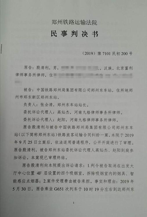 原標題:律師起訴鄭州東站設吸煙室案 一審判決:駁回律師訴請