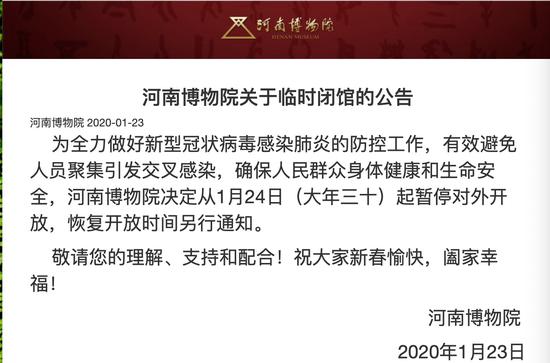 公告稱:為全力做好新型冠狀病毒感染肺炎的防控工作,有效避免人員聚集引發交叉感染,確保人民群眾身體健康和生命安全,河南博物院決定從1月24日(大年三十)起暫停對外開放,恢復開放時間另行通知。