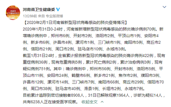 2020年1月31日0-24時(shí),河南省新增新型冠狀病毒感染的肺炎確診病例70例。新增確診病例中,鄭州市6例、開(kāi)封市2例、洛陽(yáng)市2例、平頂山市1例、安陽(yáng)市4例、新鄉(xiāng)市6例、許昌市4例、漯河市1例、三門(mén)峽市1例、南陽(yáng)市5例、商丘市2例、信陽(yáng)市21例、周口市2例、駐馬店市10例、永城市3例。