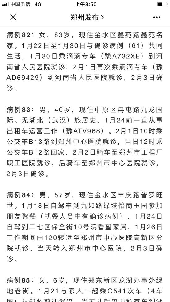 據(jù)“鄭州發(fā)布”,2月3日鄭州市新增13例確診病例信息情況通報(bào)顯示病例83是一位出租車司機(jī):“男,40歲,現(xiàn)住中原區(qū)冉屯路九龍國(guó)際。無(wú)湖北(武漢)旅居史,1月24日前一直從事出租車運(yùn)營(yíng)工作(豫ATV968)。2月1日10時(shí)乘公交車B13路到鄭州中心醫(yī)院就診,當(dāng)日12時(shí)乘公交車B12路回家,2月2日騎車至鄭州市工程廠職工醫(yī)院就診,后騎車至鄭州市中心醫(yī)院就診,2月3日確診。”
