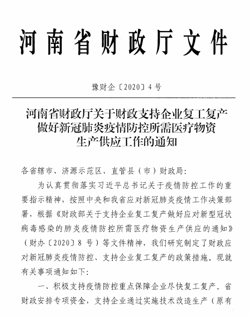 在豫財企[2020]4號文中,河南省財政廳明確了9項舉措,支持企業復工復產,保障醫療物資生產供應。