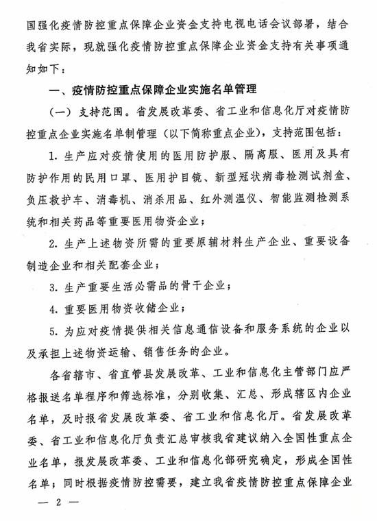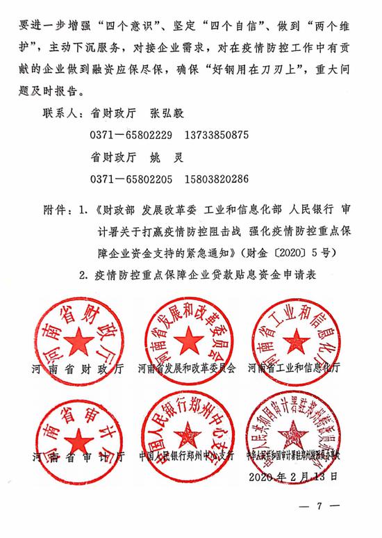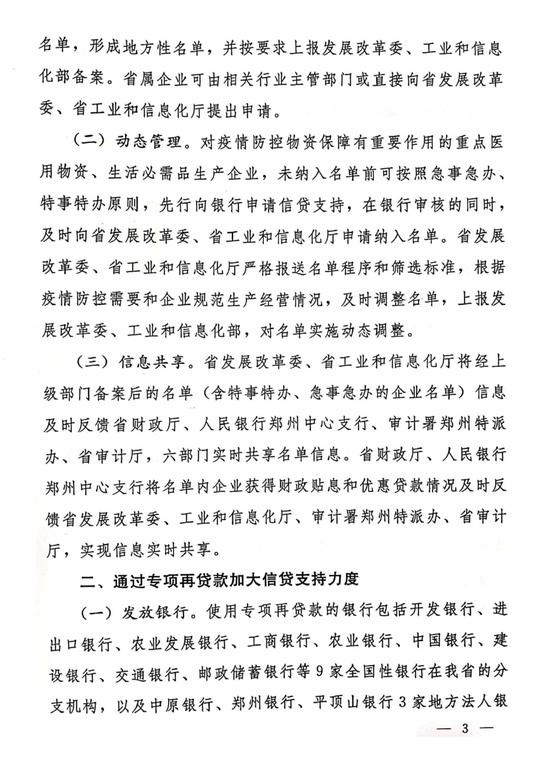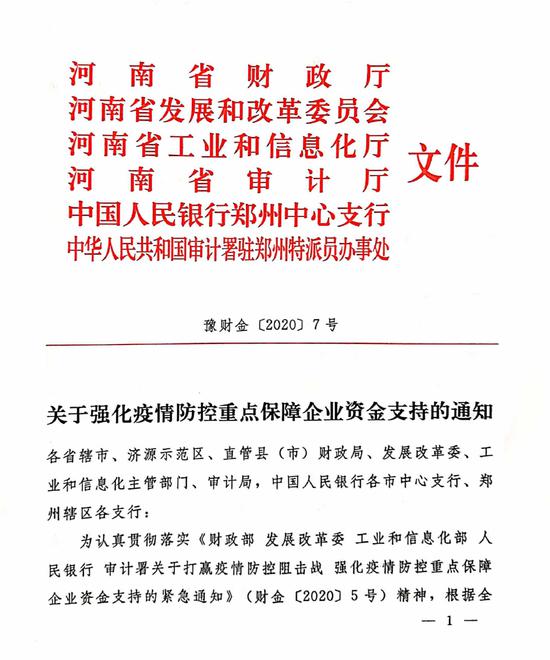 就在前一天,2月14日,河南省財政廳剛剛聯合省發改委、省工信廳、省審計廳、人行鄭州中心支行、審計署駐鄭州特派員辦事處等部門下發《關于強化疫情防控重點保障企業資金支持的通知》(豫財金[2020]7號),明確對疫情防控重點保障企業實施名單制管理,通過專項再貸款加大信貸支持力度,凝聚部門合力,強化疫情防控重點保障企業資金支持。