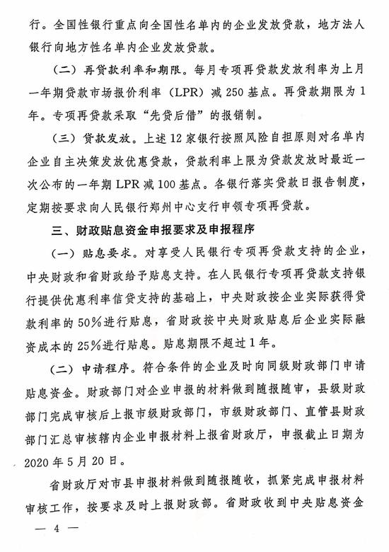 豫財金[2020]7號文明確提到,企業納入疫情防控重點保障企業名單后,將通過專項再貸款加大信貸支持力度。由12家專項再貸款發放銀行按照風險自擔原則,對名單內企業自主決策發放優惠貸款,貸款利率上限為貸款發放時最近一次公布的一年期LPR減100基點。再貸款期限為1年。