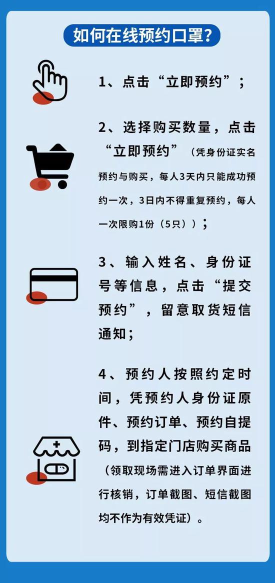 二、實行預約購買:采取線上預約、線下指定藥店有序購買的方式投放。市民憑本人身份證預約成功后,可憑提醒短信和本人身份證原件就近選擇指定藥店購買,每人一次限購1份(5只),每店限100份(500只),當日投放量約滿即止。