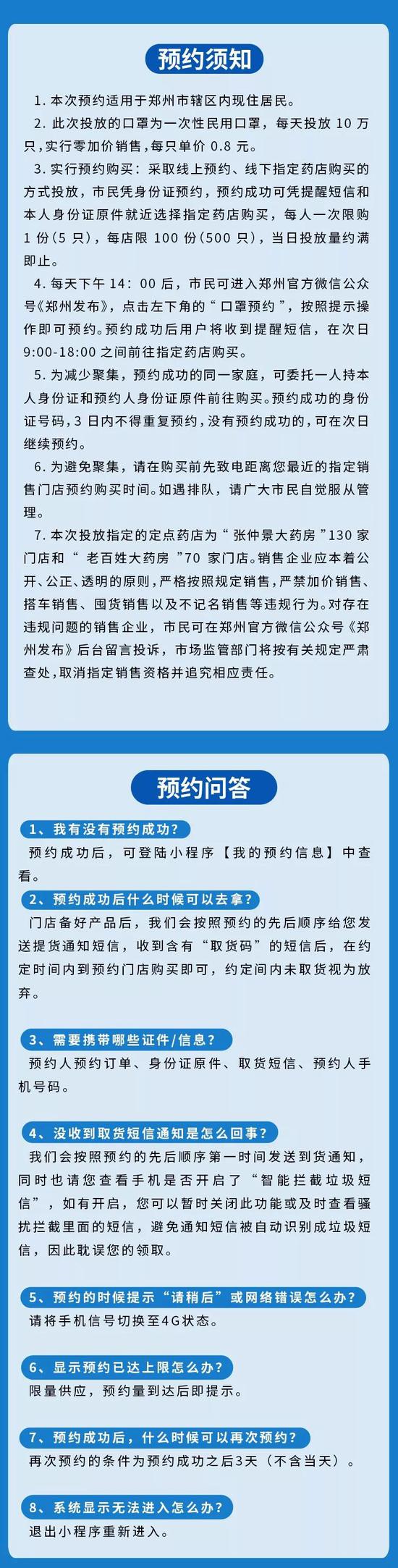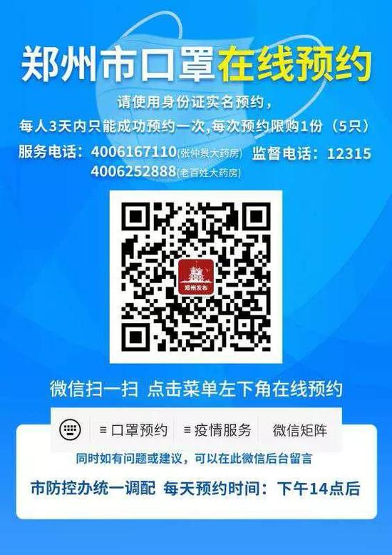 三、微信預約流程:每天下午14:00后,市民可進入鄭州官方微信公眾號《鄭州發布》,點擊左下角的“口罩預約”,按照提示操作即可預約。預約成功后用戶將收到提醒短信,在次日9:00-18:00之間前往指定藥店購買。為減少聚集,預約成功的同一家庭,可委托一人前往購買,同時持本人身份證和預約人身份證原件。預約成功的身份證號碼,3日內不得重復預約,沒有預約成功的,可在次日規定時間繼續預約。