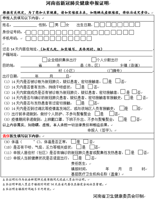 (三)強化信息化支撐。為方便有關地方和用人單位查驗外出人員健康申報證明結果,健康申報證明服務統一使用省衛生健康部門開發的“河南省新冠肺炎健康申報網上服務平臺”。平臺上線之前,企業用工需求緊急,并經人力資源社會保障部門組織集體運輸返崗的,基層醫療機構可手工辦理健康申報證明。