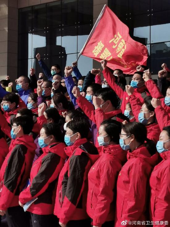 2月21日下午3點,河南第十一批、第十二批支援湖北醫療隊在河南省衛生健康委員會樓前廣場集結,參加出征儀式,啟程奔赴武漢。河南省人民政府副秘書長黃東升為隊員們送行。