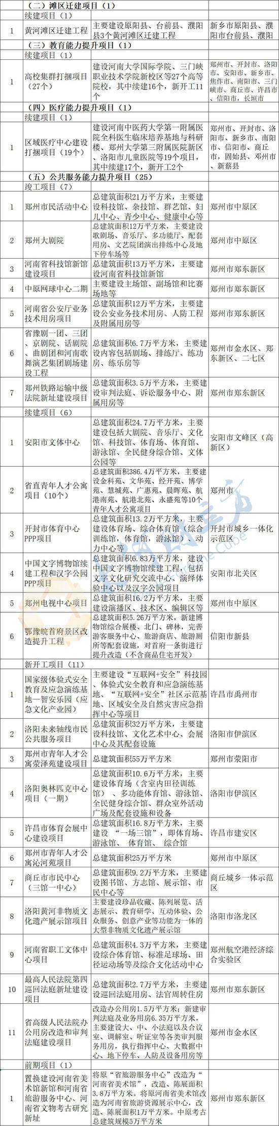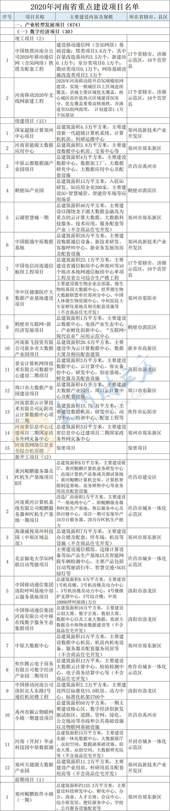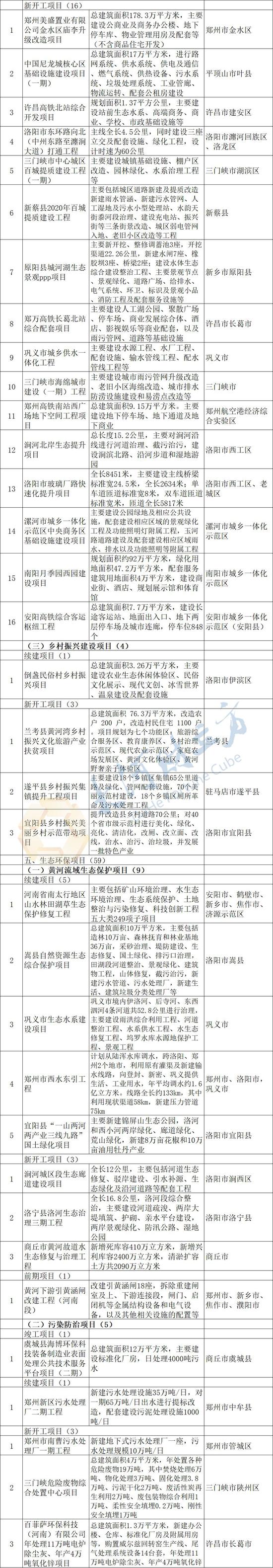 2月20日,河南省重點(diǎn)項(xiàng)目建設(shè)網(wǎng)發(fā)布《2020年河南省重點(diǎn)建設(shè)項(xiàng)目名單》。名單共列項(xiàng)目980個(gè),總投資3.3萬億元,2020年計(jì)劃完成投資8372億元,涵蓋了產(chǎn)業(yè)轉(zhuǎn)型發(fā)展、創(chuàng)新驅(qū)動(dòng)、基礎(chǔ)設(shè)施、新型城鎮(zhèn)化、生態(tài)環(huán)保、民生和社會(huì)事業(yè)六大領(lǐng)域,其中計(jì)劃竣工項(xiàng)目147個(gè)、續(xù)建項(xiàng)目481個(gè)、計(jì)劃新開工項(xiàng)目335個(gè)、前期項(xiàng)目17個(gè)。