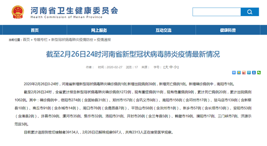 2020年2月26日0-24時,河南省新增新型冠狀病毒肺炎確診病例1例,新增出院病例39例,新增死亡病例1例。新增確診病例中,南陽市1例。