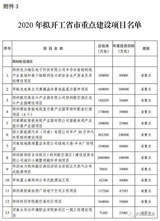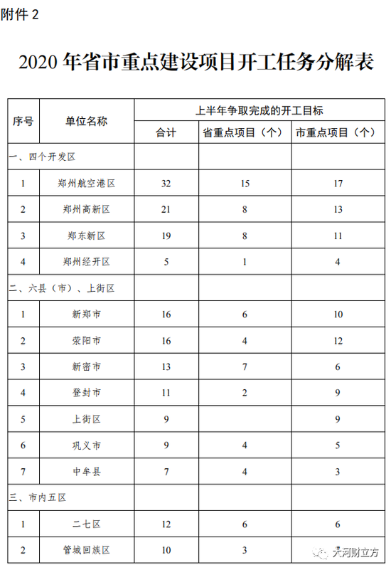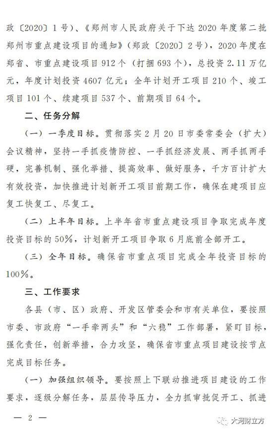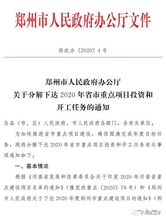 3月2日,鄭州市人民政府辦公廳發布《關于分解下達2020年省市重點項目投資和開工任務的通知》(以下簡稱《通知》)。