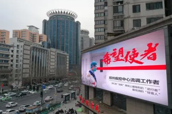 3月16日晚,從鄭東新區的“大玉米”到中原區奧體中心,綠城鄭州千萬座LED顯示屏同時點亮,用流動的光影向抗疫英雄致敬!出租車、公交車、地鐵滾動著“光明使者,希望使者,最美天使,真正英雄,武漢必勝,湖北必勝,中國必勝”的宣傳語鏗鏘有力。