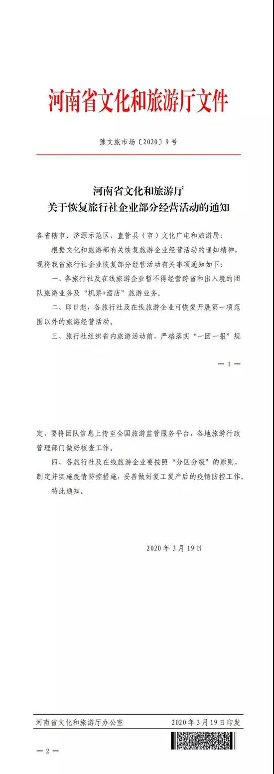 原題:《河南省旅行社企業,即日起可恢復部分經營!
