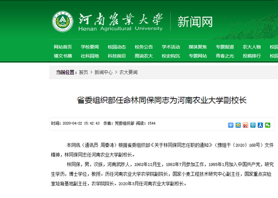 根據省委組織部《關于林同保同志任職的通知》(豫組干〔2020〕168號)文件精神,林同保同志任河南農業大學副校長。