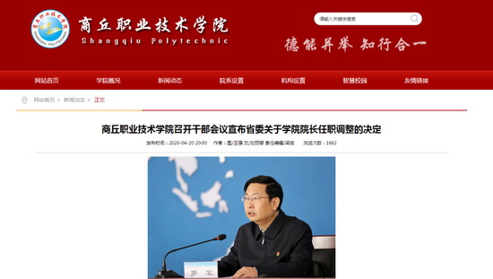 李瑞華宣讀了中共河南省委關于學院院長任職調整的決定:薛明志同志任商丘職業技術學院院長,免去劉合行同志商丘職業技術學院院長的職務。