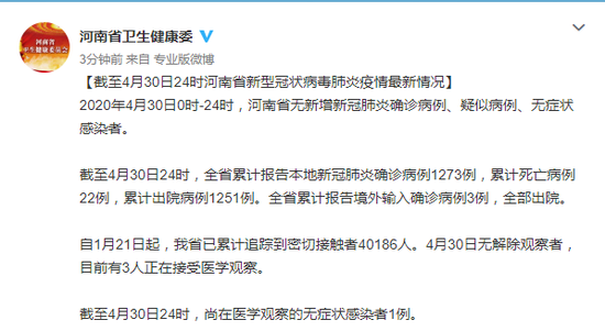 截至4月30日24時,全省累計報告本地新冠肺炎確診病例1273例,累計死亡病例22例,累計出院病例1251例。全省累計報告境外輸入確診病例3例,全部出院。