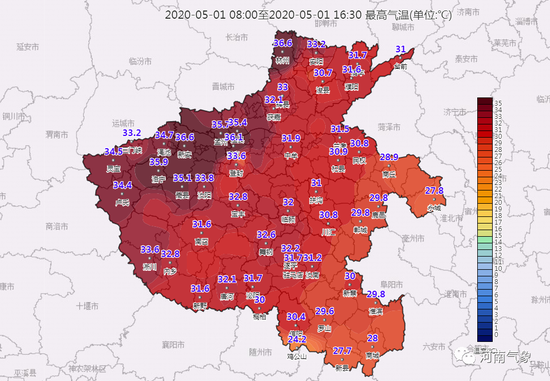 昨天河南西北部和安陽西北部地區(qū)最高氣溫34-36℃,東部、東南部28-30℃,其它大部地區(qū)30-32℃