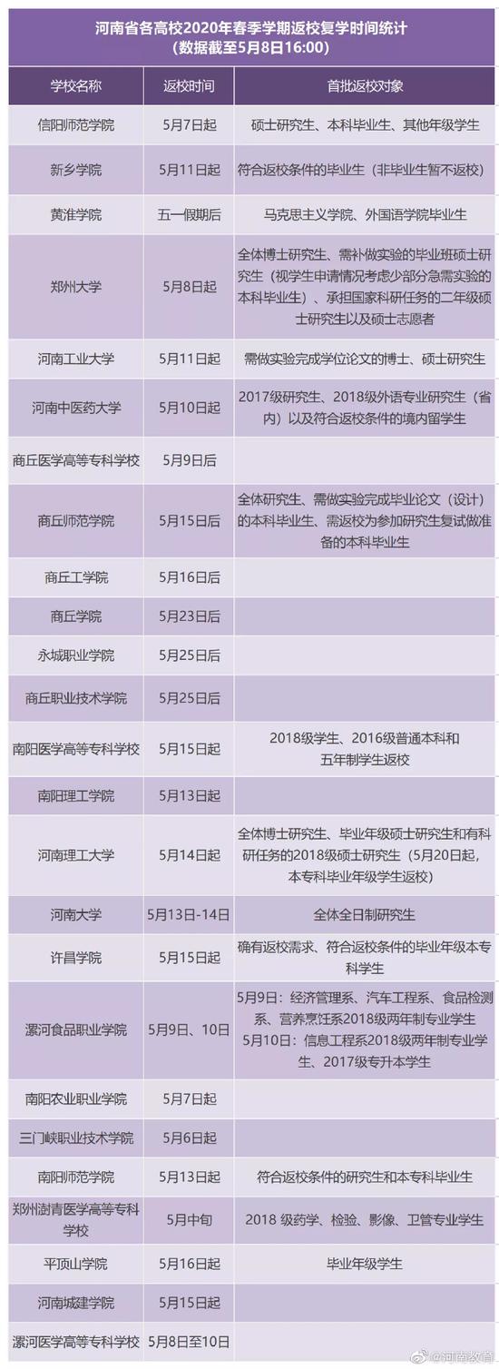 截至5月8日16時,我省已有鄭州大學、河南大學等25所高校明確返校復學時間。 (具體返校復學詳情以各校官方通知為準) 。