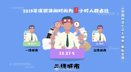這些年,“忙”成了很多中國人生活的主旋律,央視財經《中國經濟生活大調查》通過數據發現,過去一年里,中國人確實比以前更忙了。每天的平均休閑時間是2.42小時,比2018年的2.84小時少了25分鐘。石家莊、鄭州、西安、呼和浩特、西寧、廣州、哈爾濱、烏魯木齊、南京和銀川是中國最忙碌十大城市,廣州居民日均休閑時間只有1.84小時,是北上廣深一線城市中最忙碌的;一二三線城市相比,二線城市居民2019年休閑時間為0小時的人群占比有13.27%,超過一線城市(10.02%)和三線城市(11.70%)。