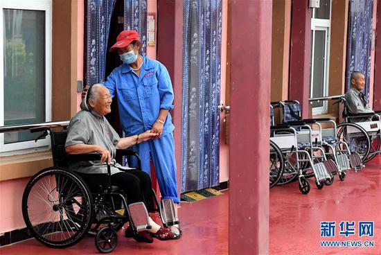 7月9日,在河南省范縣德潤重度特困人員托養中心,護工與托養人員聊天互動。新華社記者 李安 攝
