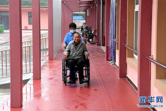7月9日,在河南省范縣德潤重度特困人員托養中心,護工將托養人員推回房間。新華社記者 李安 攝