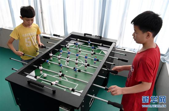 7月10日,在河南省范縣社會福利中心,兩名小朋友在玩桌上足球。新華社記者 李安 攝