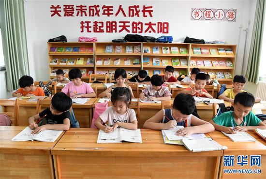 7月10日,河南省范縣社會福利中心的孩子們在寫作業。
