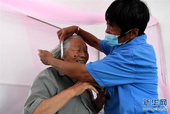 7月9日,在河南省范縣德潤重度特困人員托養中心,護工為托養人員梳頭。新華社記者 李安 攝
