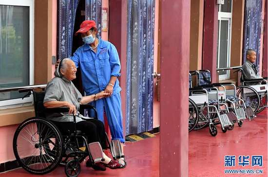 7月9日,在河南省范縣德潤重度特困人員托養中心,護工將托養人員推回房間。新華社記者 李安 攝