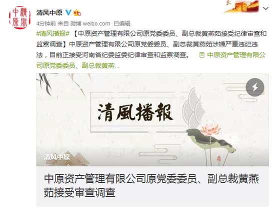 原標(biāo)題:《中原資產(chǎn)管理有限公司原黨委委員、副總裁黃燕茹接受紀(jì)律審查和監(jiān)察調(diào)查》