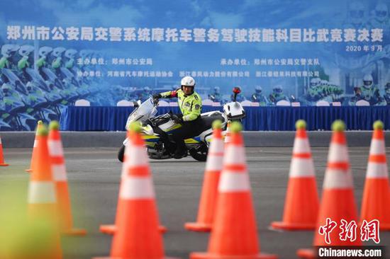 圖為一名騎手駕駛摩托車通過反光錐擺放成的繞樁賽道。鄭州市交警支隊供圖