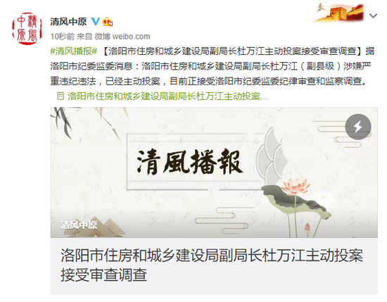 據洛陽市紀委監委消息:洛陽市住房和城鄉建設局副局長杜萬江(副縣級)涉嫌嚴重違紀違法,已經主動投案,目前正接受洛陽市紀委監委紀律審查和監察調查。