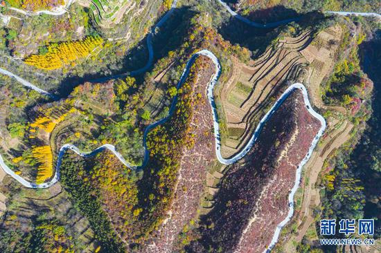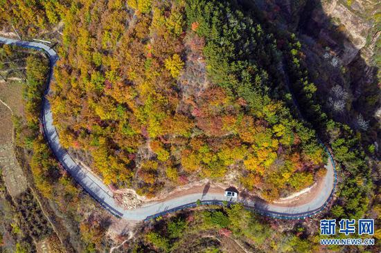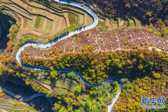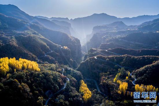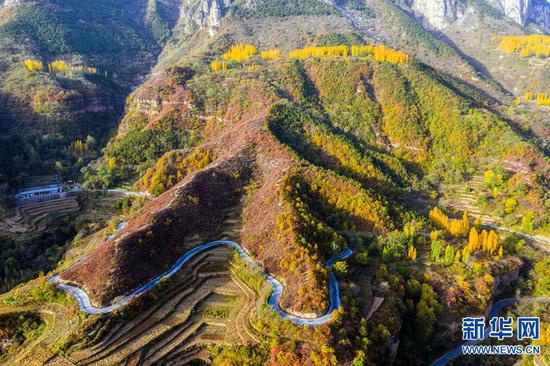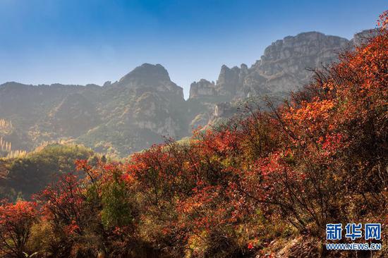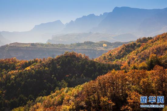 太行山的秋天,是用生命燃燒的色彩,層林盡染,嬌艷欲滴。像畫家手中的調色板,呈現出一幅美麗的畫卷,層層疊疊,蔚為壯觀。新華網發(麻翛然 攝)