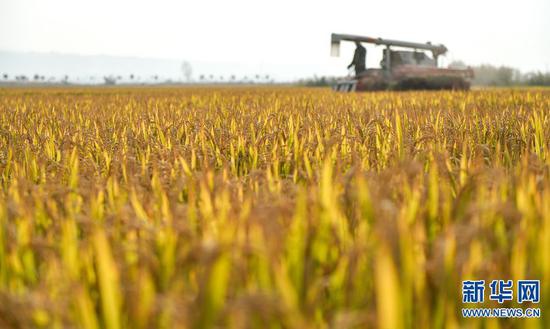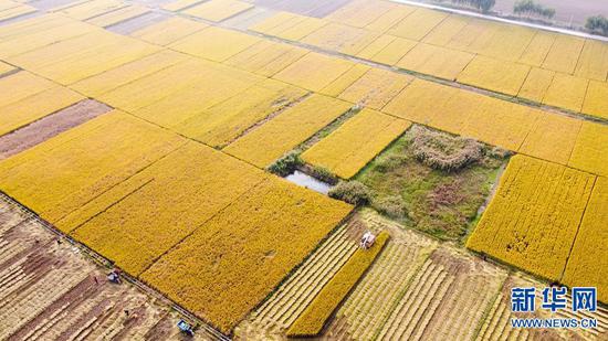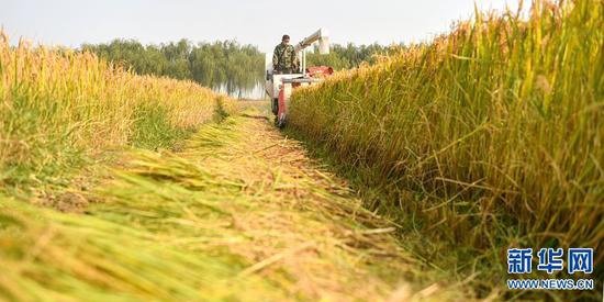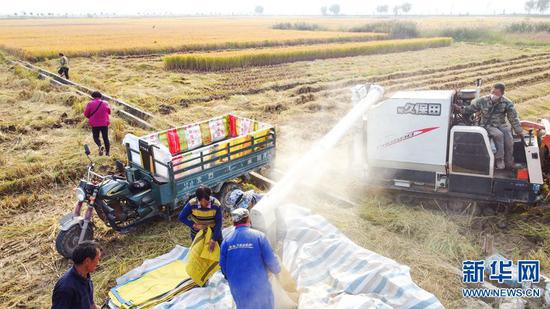 2020年10月25日,河南洛陽,位于孟津縣會盟鎮黃河灘區的萬畝優質水稻種植示范基地內,農民們正搶抓有利時機,確保水稻顆粒歸倉。