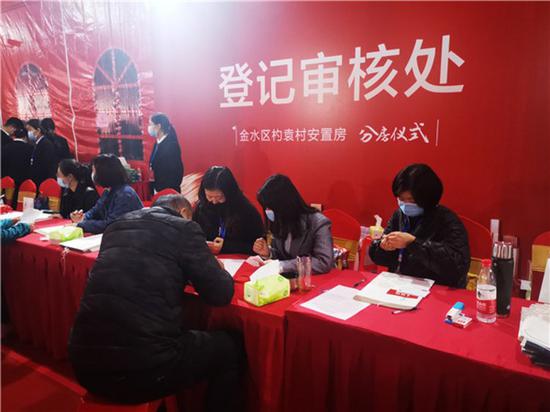 上午7點30分,所有的工作人員到崗到位,按照預先演練流程,有條不紊的進行,前來排隊領號的群眾,滿臉洋溢著期待和興奮。抽號臺上,四個戶型的透明抓鬮箱整齊排放,審核領號,房號抓鬮,登記公證等,一環扣一環,現場井然有序。