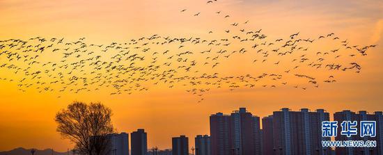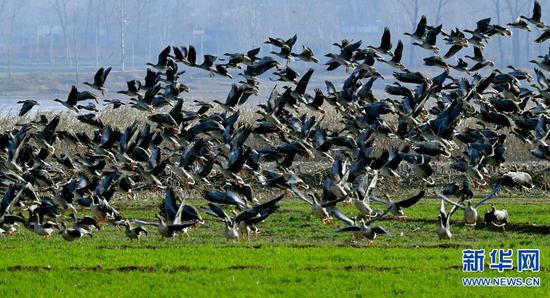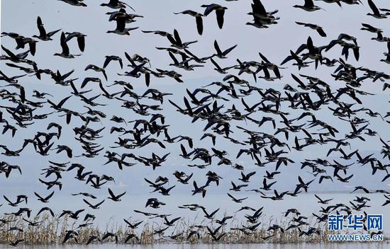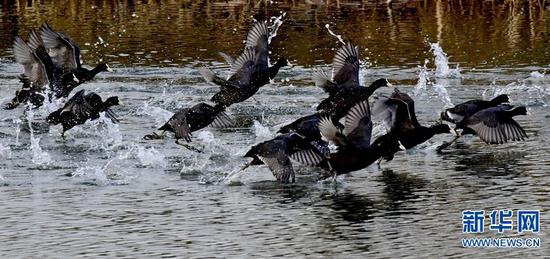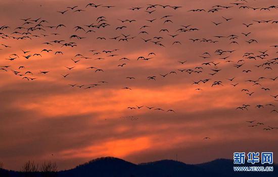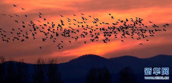 12月13日,河南省嵩縣陸渾湖國家濕地公園,群鳥飛翔,頗為壯觀。