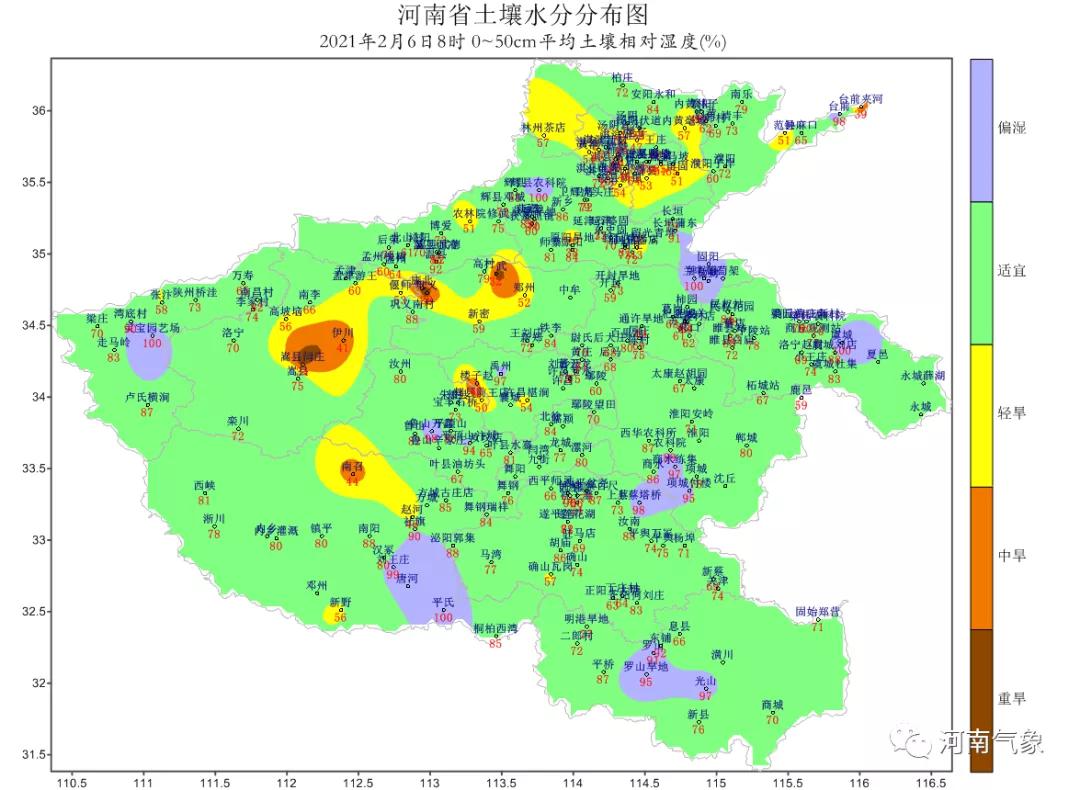 氣象監(jiān)測(cè)顯示,今年1月1日-2月6日全省平均降水量3.6毫米,較常年同期(14.2毫米)偏少75%,為2012年以來同期最少值,全省最長(zhǎng)連續(xù)無有效降水日數(shù)為17~37天,其中黃河以北和中部大部已連續(xù)37天無有效降水;全省平均氣溫3.2℃,較常年同期(0.8℃)偏高2.4℃,為1961年以來第4高。由于降水偏少氣溫偏高,截止2月6日全省有66%的站點(diǎn)出現(xiàn)輕度氣象干旱,主要分布在北中部地區(qū)大部和南陽(yáng)、駐馬店兩市局部。目前,全省有41個(gè)測(cè)站墑情不足,主要分布在豫西、豫北地區(qū);其余測(cè)站墑情適宜。