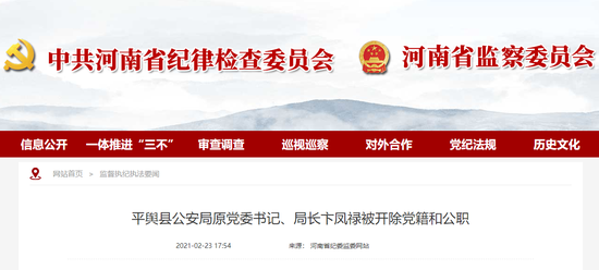 原標題:《平輿縣公安局原黨委書記、局長卞鳳祿被開除黨籍和公職》