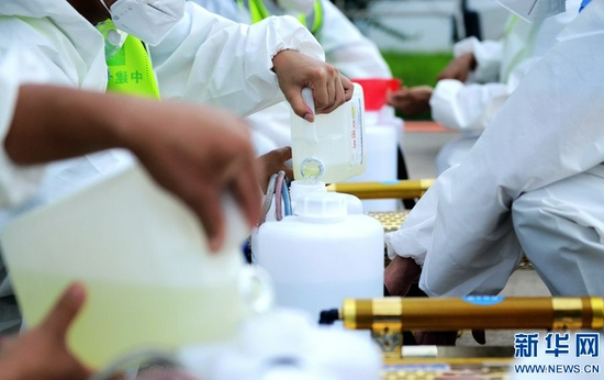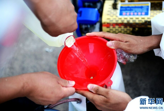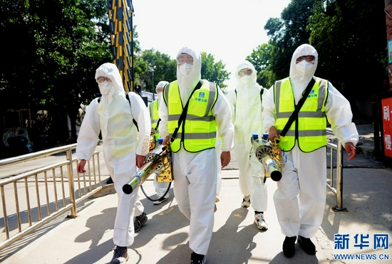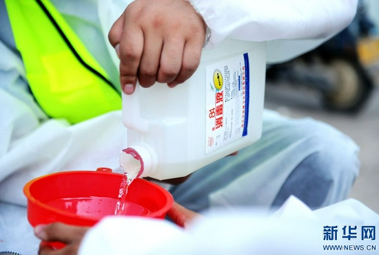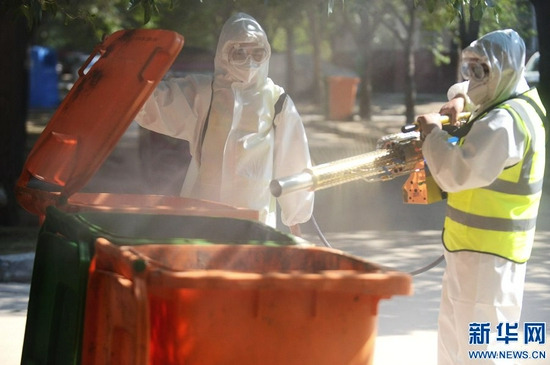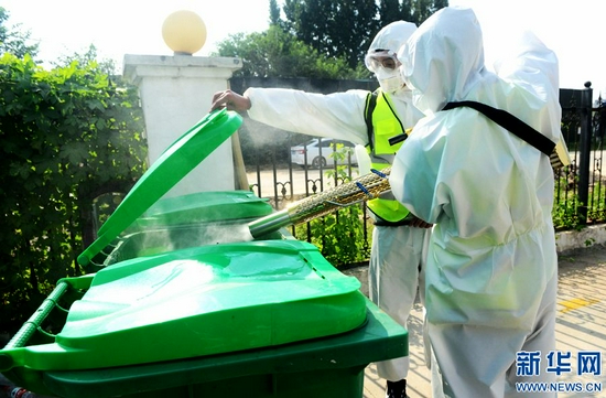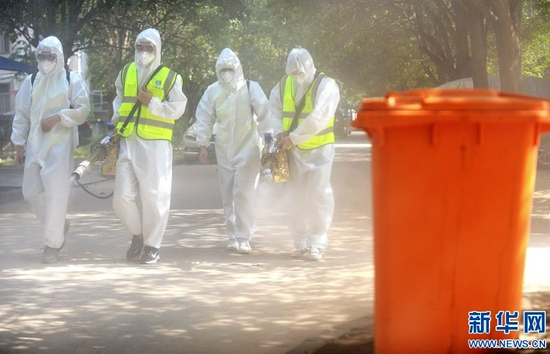 為有效應(yīng)對災(zāi)后可能出現(xiàn)的傳染疾病疫情,鄭州市開展清垃圾(雜物)、清污(淤)泥和消毒消殺的“兩清一消殺” 工作,對小區(qū)道路、垃圾箱、活動(dòng)器材等設(shè)施進(jìn)行消毒。新華網(wǎng)發(fā)(王克偉 蔣紅中 攝)