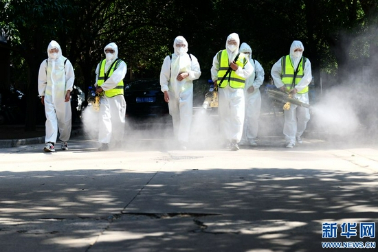 7月27日,工作人員在鄭州市高新區(qū)瑞達(dá)路南流小區(qū)進(jìn)行消毒消殺作業(yè)。