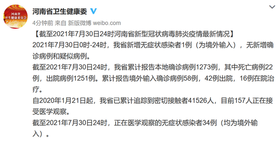 2021年7月30日0時-24時,我省新增無癥狀感染者1例(為境外輸入),無新增確診病例和疑似病例。