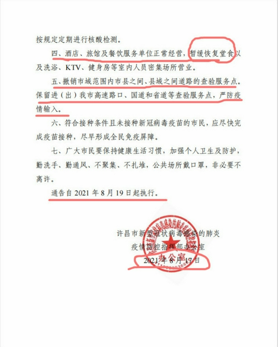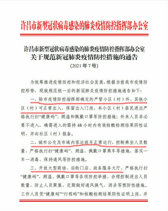 8月17日晚些時候,許昌市新型冠狀病毒感染的肺炎疫情防控指揮部辦公室發布《關于規范新冠肺炎疫情防控措施的通告》(2021年7號)。該通告內容與先前發布的內容有較大變化。該通告自2021年8月19日起執行。通告內容如下: