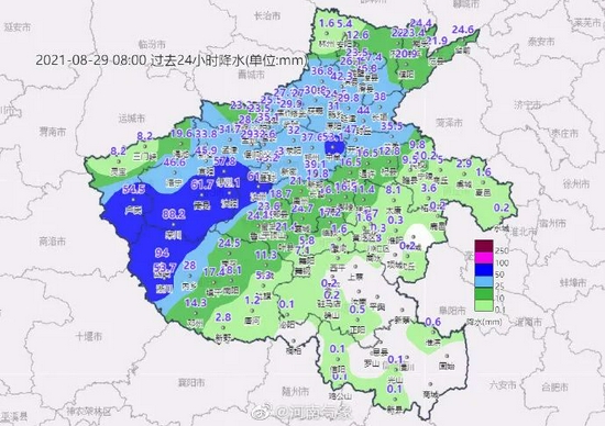 據河南氣象8月28日12時至29日4時,鄭州市出現大雨、局地暴雨,最大降水出現在登封市的玫瑰園71.0毫米,其他雨量較大的站點有鄭州的張莊49.9、商鼎路46.4、鞏義市的百老匯40.8、登封佛垌55.4、滎陽市的桑園36.6、新密市的大隗54.4、新鄭市的郭店56.9、中牟縣的狼城崗59.8。