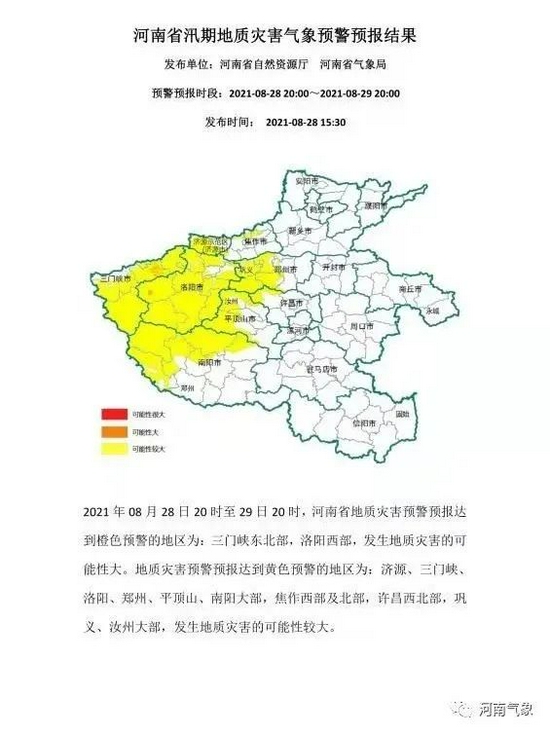 河南省自然資源廳、河南省氣象局聯合發布2021年08月28日20時至29日20時,河南省地質災害預警預報。