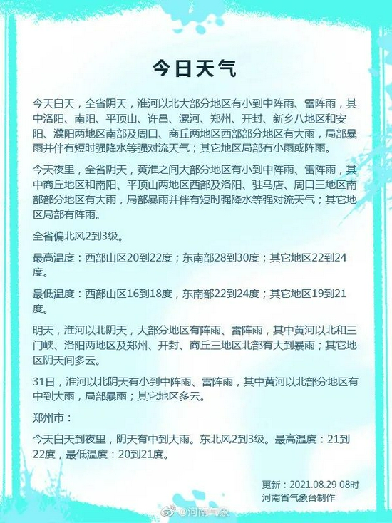 據河南省氣象臺天氣預報,自8月25日晚開始的持續降雨過程仍將影響河南省。29日,全省有陣雨、雷陣雨,中西部有中雨,局部大雨或暴雨。30日,淮河以北大部分地區有小到中陣雨、雷陣雨,其中安陽、鶴壁、濮陽、新鄉、濟源、焦作六地區和鄭州、開封兩地區北部有大到暴雨,并伴有短時強降水、短時大風等強對流天氣。31日,淮河以北有陣雨、雷陣雨,其中沿黃及以北地區有中到大雨,局部暴雨。強降水主要集中在30日夜里。過程累計降水量:西部和中北部80-120毫米,局部150-180毫米。