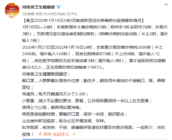 [截至2022年1月18日24時河南省新型冠狀病毒肺炎疫情最新情況]
