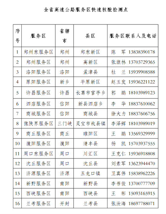 七、全省高速公路服務區目前設置了哪些快速核酸檢測點?