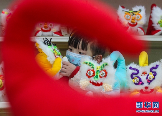 1月26日,河南省鎮平縣城侯氏手工布藝編織館內,一名小朋友在觀看“生肖虎”。
