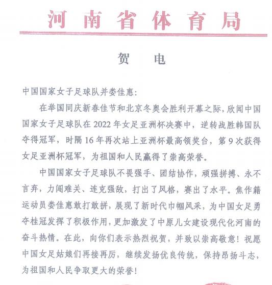 原標題:《河南省體育局向中國女足及兩位河南籍女足運動員發去賀電》